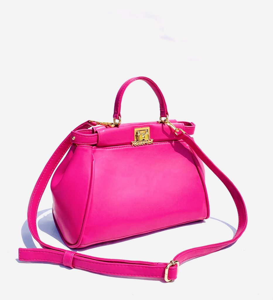 It features a sturdy carry handle, an interesting top panel that holds the Handle in place and closes with a bag lock, while keeping the sides in place with stud rivets. It has ample space, featuring an inner zipper pocket and a slip pocket for all your daily essentials.